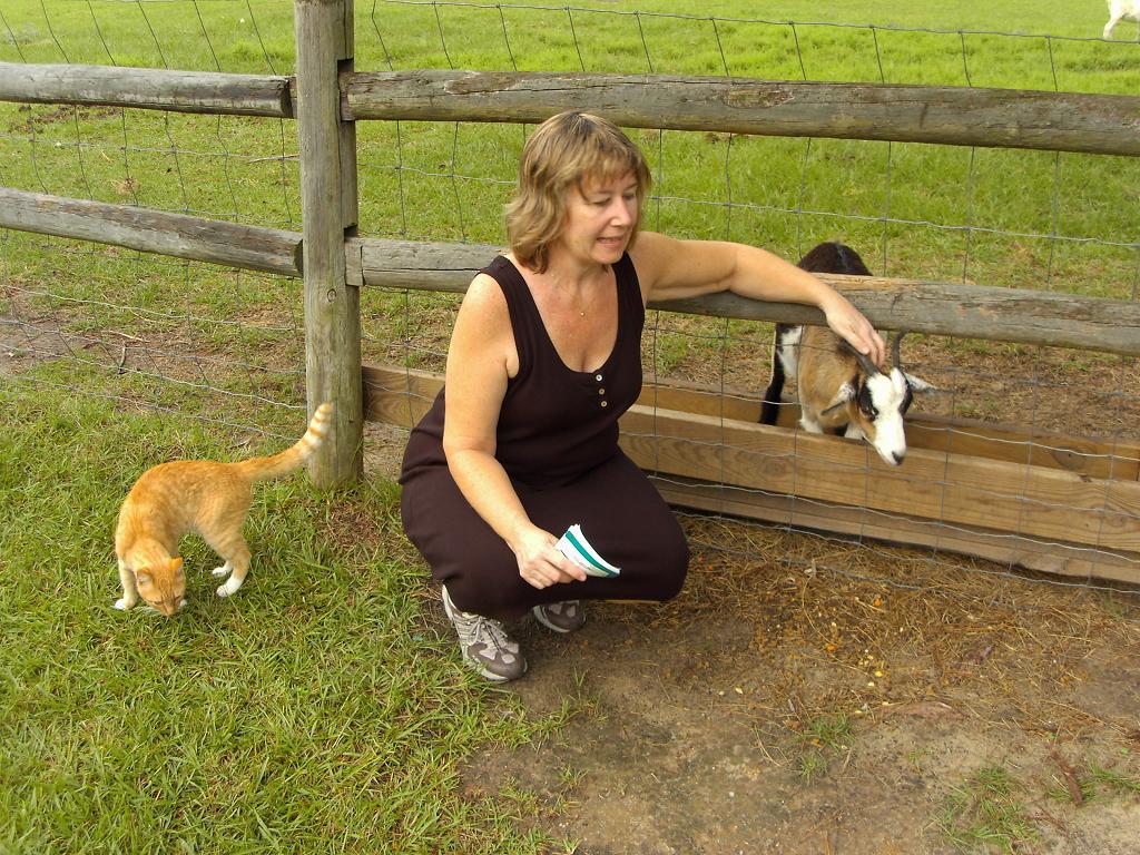 Ann's ready to go, and yes, she meant to wear those sneakers with that dress AND wanted me to take the picture. Mules and goats shared the pasture. Everywhere you look there are trees. There's even one growing out of my head! We eventually made it to the nature trails, one of which follows the 17 mile river (more like swamp), full of cypress trees like this huge specimen.