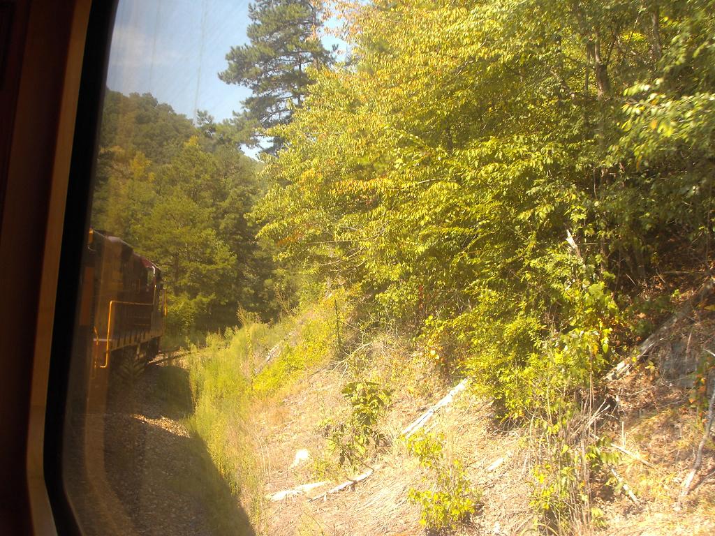 We cross an old style strap girder trestle over the Fontana Lake, albeit much further upstream than Fontana Village where we stayed the night before. I left this picture big so you get all the detail. Looks like someone beat me to the glass insulators though. They warned all the open car passengers to remain seated and within the car at all times. Wonder why...