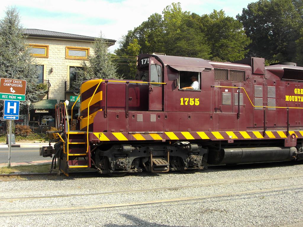 Here we go on our Great Smoky Mountain Railway excursion through the Nantahala River Gorge. I just love this picture of Ann and that sparkle in her eyes. Maybe it's because we're in the club car? NO! It's not the alcohol! It's the no kids allowed because of the alcohol policy! You can see the GP9 engine coupled to our end of the train on the way out. Once we reach the Nantahala Outdoor Center Depot, it uncouples, runs around and couples to the other end of the train for the trip back.