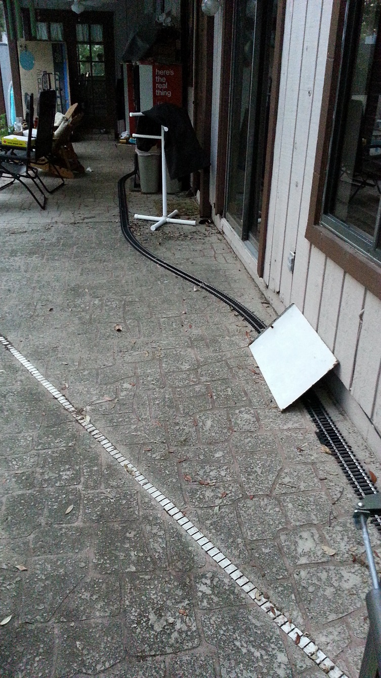 I slowly started acquiring track and rolling stock, in addition to our Christmas presents to each other and our new Royal Blue set. I started with an oval on just the patio using the 10' diameter Aristocraft stainless steel track. I also snagged a pair of Aristocraft wide radius stainless steel switches and some straights of various lengths. You guessed it... The original switch loop. It just went from there. I tried the loop within a loop, but the switches and crossings I have are two different angles. It appears the switches are roughly 20° (19° perhaps?), but the crossings are 30°. I didn't think it was going to be like the HO scale 18" radius switches that have a little 10° chunk to add to make it fit like a full curve section.