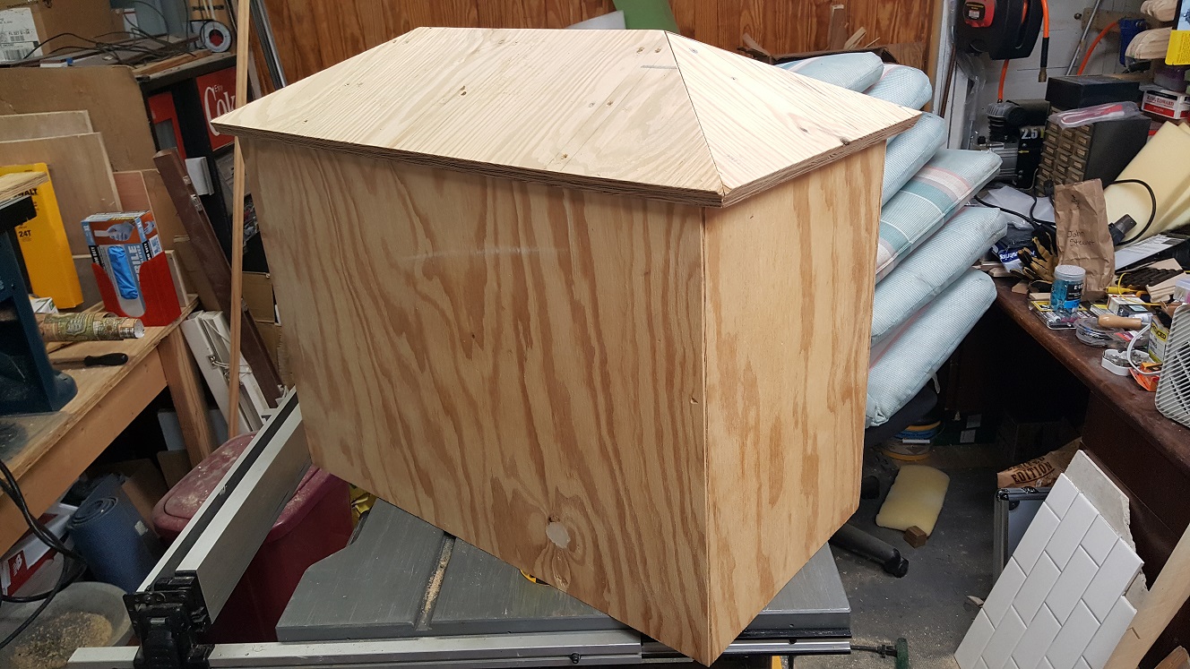 I hang my drenched shirt over the hamper and grab a work towel from the cabinet to lay back against in my recliner, after getting an ice water refill. Ahhhh... That's better. Normally I would have a beer about now, after catching up on my hydration, but I'm still not feeling 100% yet. After dinner, I showed Nick the joints I cut earlier how I and assembled the sides. Then I put the roof on, and took pictures. Nick was impressed. I'll be impressed when it's done.