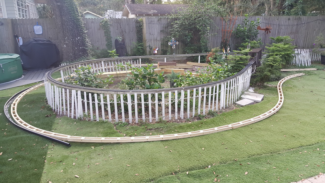 As I'm soaking in the hot tub after putting everything away, I ask Ann about the placement and whether it takes too much room. She asks if I could make it curve closer to the upper loop on the side by the path. I tell her I could probably get it a foot closer using the flex track, but I can't get it too much closer because of the "natural" barrier that would exist in the prototype unless it were a rock cut, a rock cut that would hide all of those pretty hibiscus flowers behind it, those hibiscus flowers I told her we should put in a planter to staircase them up from behind the upper loop before we planted them... Most of which I'm only thinking to myself, not saying to her. I tell her I may be able to do it and make it look realistic with a trestle running around to the bridge as it comes out of a rock cut where we are building up the terraced planters for the waterfalls and water feature.