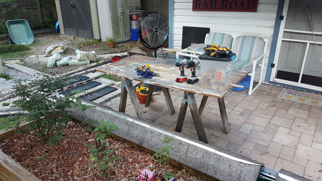 Last weekend I had to call it quits on account of lightning striking way too close just as I ran out of separator blocks for making any more of the curved stringers for the new lower loop. Just before that, the table saw starting throwing a "rooster tail" of sawdust off the blade, so I knew the shop vac bag was full and needed emptied. Thankfully I emptied that before the weather set in, but the first thing I need to do todya is put a new bag in it and get everything set back up to rip the remaing 2x4s... Including setting up my makeshift sawhorse bench and moving the template and chop saw, and everything else in the way of ripping, back out of the garage and onto the patio workbench. I got that far and vacuumed up the sawdust on and around the table saw. Now I'm sitting here updating this for the moment while I cool off and let the 2x4s dry out in the sun. Every single one of them is soaking wet from the rain.