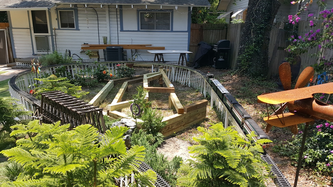 Our story here isn't finished either. The planning, started for the new staircased planter inside the upper loop, stalls while we discuss the size and scale of the new planter. In my original vision of the layout, both loops were supposed to be one on top of the other at the near end of the yard, with the lines crossing each other, at grade, on the far end where they would loop back around. But I ran out of track! So we have just the "dogbone" arrangement for our current incarnation, not the folded dogbone I had planned. That's lasted for a while, and until I bought another hundred feet of track, we couldn't even add the station siding. But we wouldn't even be talking about this had I not bought the track...
