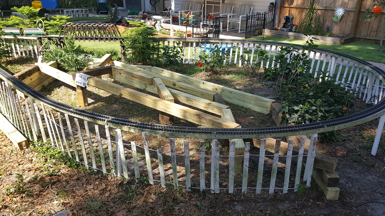 I must say I am really enjoying the waterfall fountain and pond beneath the howe truss bridge. That one vision of Ann's has set us on a course forward. I am trying to explain how I see the terraced planter working, in a staircase fashion, but she's still not seeing it even with me setting a bunch of eight foot long 4x4s in place. I grab a bunch of shorter pieces of 4x4 and arrange them the way I see the lowest tier of the terraced planter following the curve of the upper loop, coming up behind the waterfall, hiding the fact that it's just a casting... Also giving it a place for the source of the water to come from behind, not just bubbling up out of the ground in the middle of nowhere. Then the next terrace can have a source that feeds another waterfall that flows into this waterfall, etc.