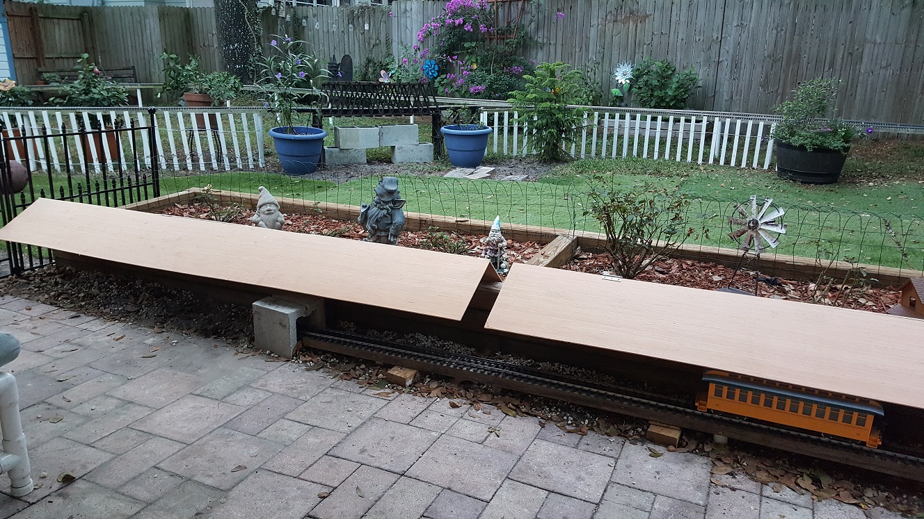 On the agenda for today is revising the station roof again. Yes again. When I tried to pull the train in under it last weekend, it got "stuck", where the plywood was too low and the engine was catching on it. I was afraid of that. I bought a couple of pressure treated 1x4s when we were at Lowe's getting the fence panels for Nick. While he and Ann are over at his place, installing the rest of the fence, I'll be installing those 1x4s under the station roof plywood to raise it another ¾". After they get a coat of linseed oil that is. And to do that, I'll need the sawhorses and my "portable work bench top" to set on them from the garden shed.