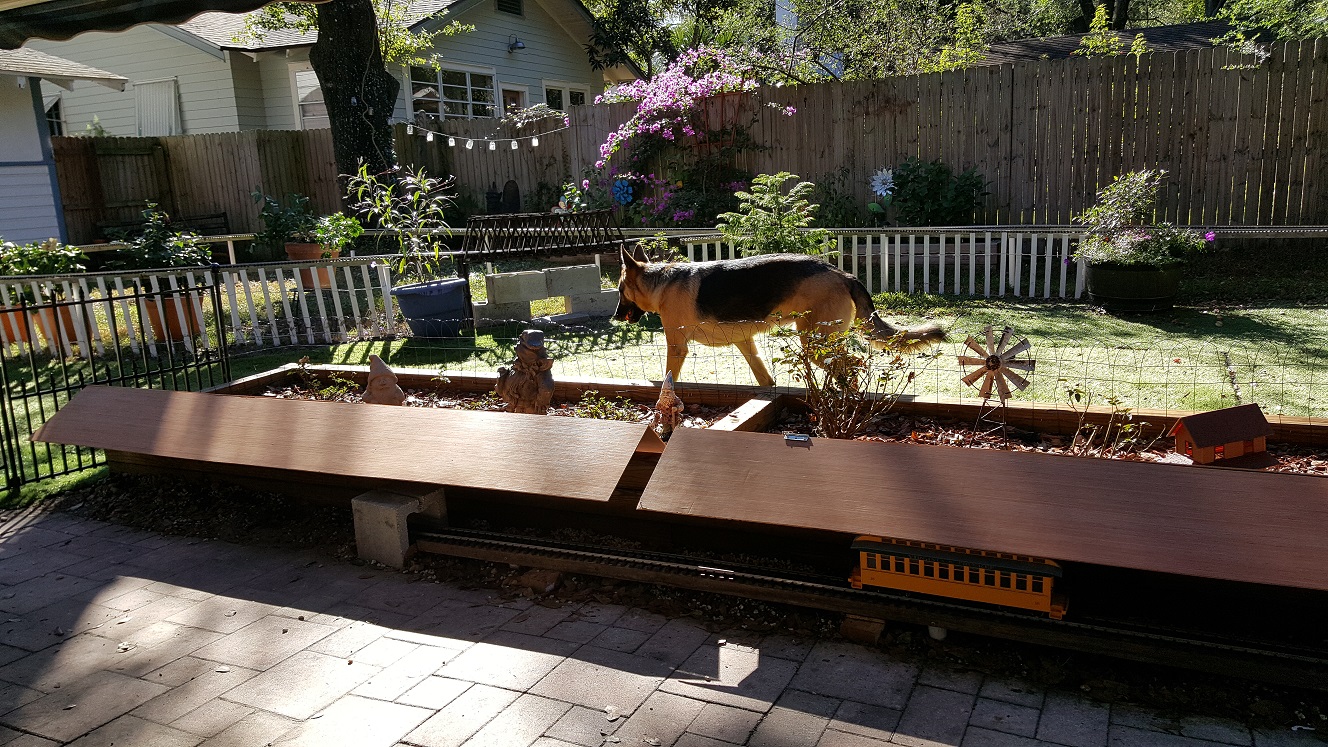 That is, until Ann throws it into the planter I'm working in... It bounces off of the plastic house and almost knocks what I'm working on off the edge of the planter. I'm more than a bit perturbed and Ann looks horrified that I'm going to yell. I do tell her she's done more damage with that one throw than the dog has done so far, but leave it at that. The problem is the Jolly Ball itself and the way it impacts off of everything. The approach trestle on one end of the bridge has yet again been destroyed. While we're watching the pup jolly ball into the still intact trestle, I mutter some comment about how it's about to be destroyed and the bridge falling when he "herds" it to the other end and knocks out the last remaining trestle bent from beneath that end of the bridge!