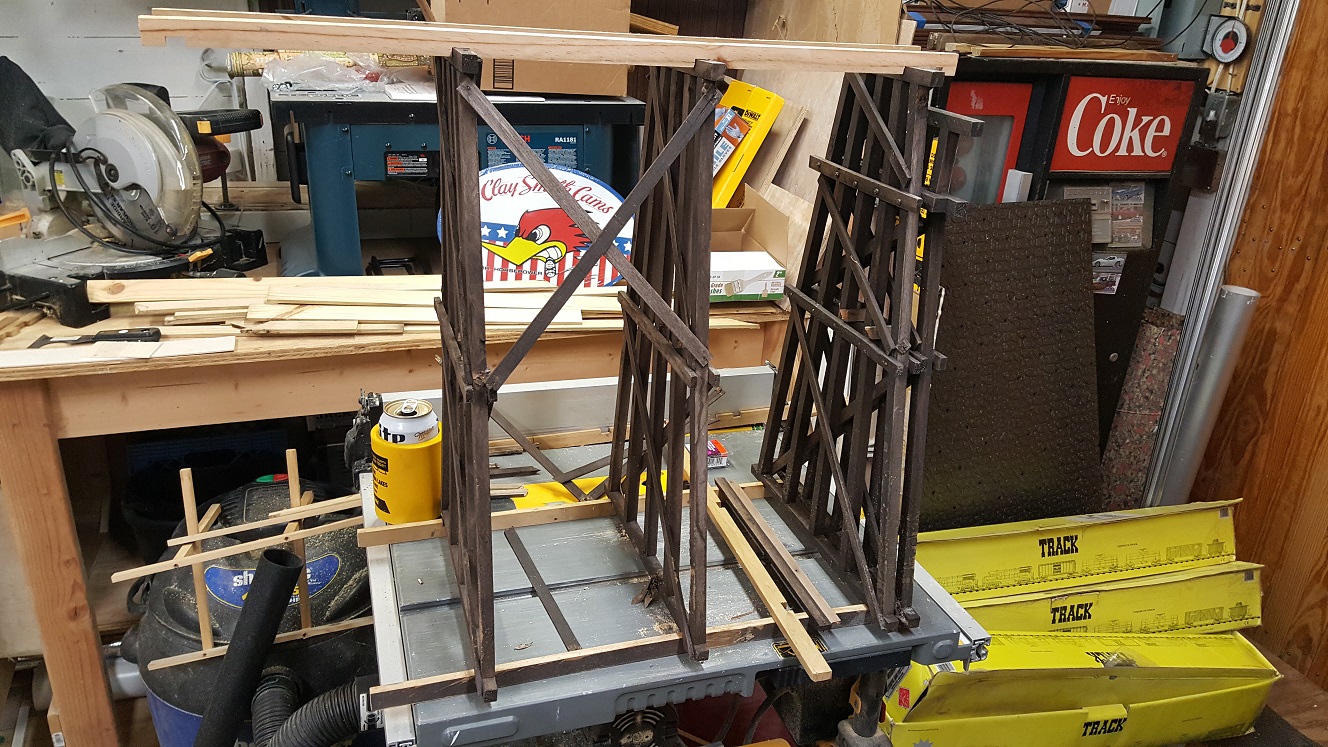 I start working on the station roof truss stuff, shortly after I get the garage squared away enough to start cutting more scale lumber. I select three of the straightest stringer pieces I can find that are at least four feet long. Amazing how wood warps over time, even when it's straight when first cut. These pieces are roughly 3⁄8" x ¾", and will connect all eight of the roof supports together, every 6". I know there is no way I'll be able to hold all of those pieces in place at 6" apart, let alone reliably, without a jig or fixture of some type.