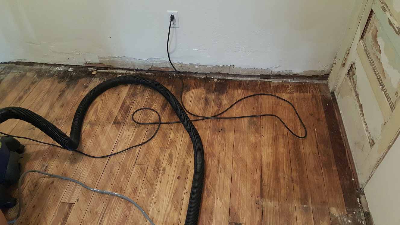 I'm running into a lot more sharps though. I move to a new area, see sparks, stop the edger and go address the latest concentration of staples or the next HUGE nailhead someone thought would be okay to use since it's near the wall, like they've never heard of finish nails or were out of them or something. Whatever. I keep going with the same disk until I find them all. Switching out the disk I start where it will show along the '70s wall first, figuring using the freshest disk where it will be seen makes more sense than wasting it on places that will be covered by cabinets or appliances. For whatever reason, I keep running into issues with leaving swirls when turning the corner in front of the door to the side porch. I wish I knew more about the operation of this thing. I guess if I did it for a living... I'd have no knees left. I manage to finish the edging and the sanding with 24 grit is complete!