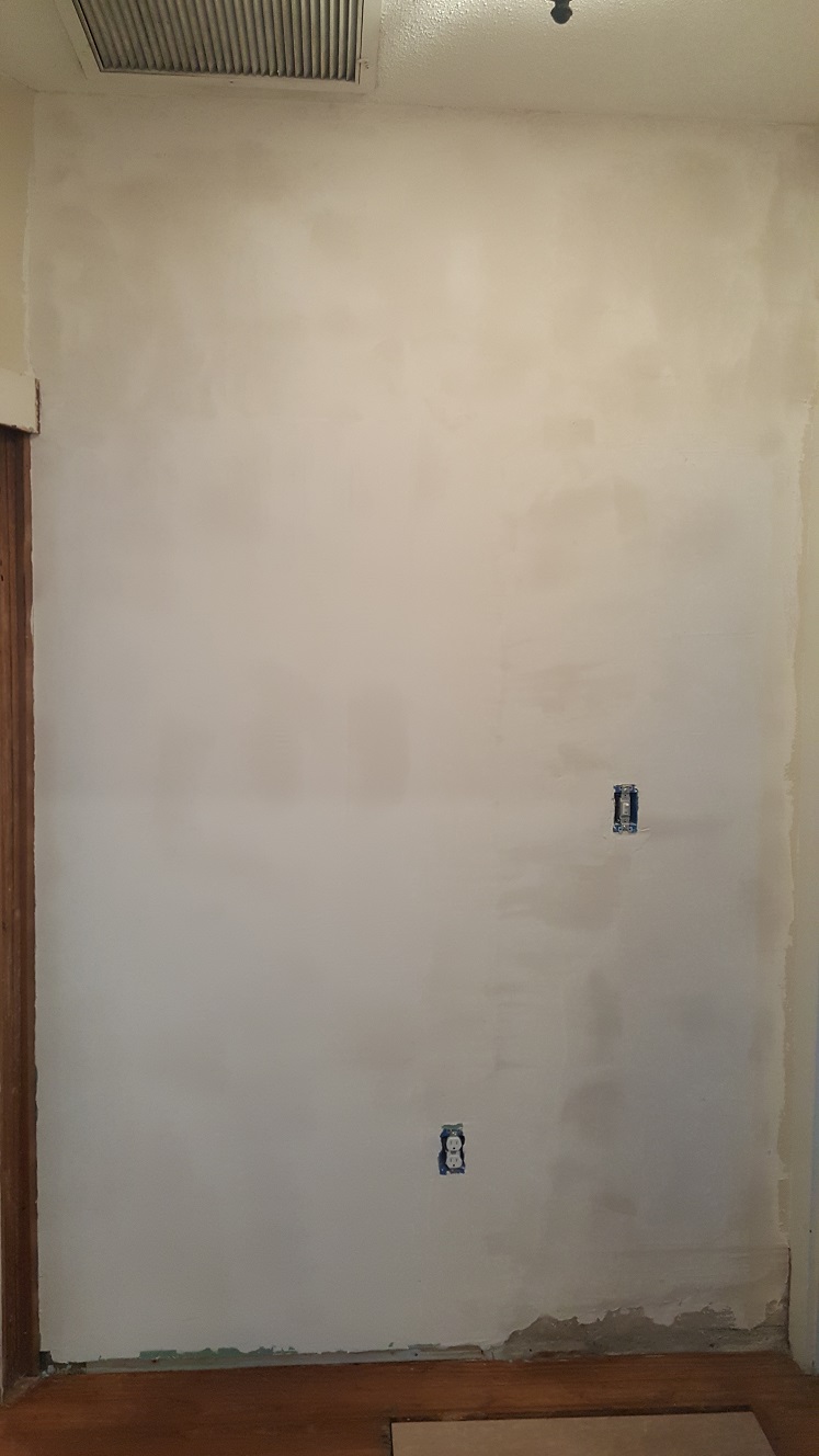 I have some prep work that needs done first, like removing the no longer used metal electrical box and the rest of the loose top coat plaster. It makes quite a mess... I had forgotten how messy it is. Thankfully Ann already has that little shop vac out to clean up the mess our constipated cat has made on the front porch, so I use that to get the plaster demolition mess up off the floor. Now to mix up some mud... I only have maybe a bucket or so of hot mix left in the bag from the kitchen, but I can get at least that much applied. I get most of the wall first coated. Had I not run out a half bucket short, I could have finished that first coat. At least, that's what I thought.