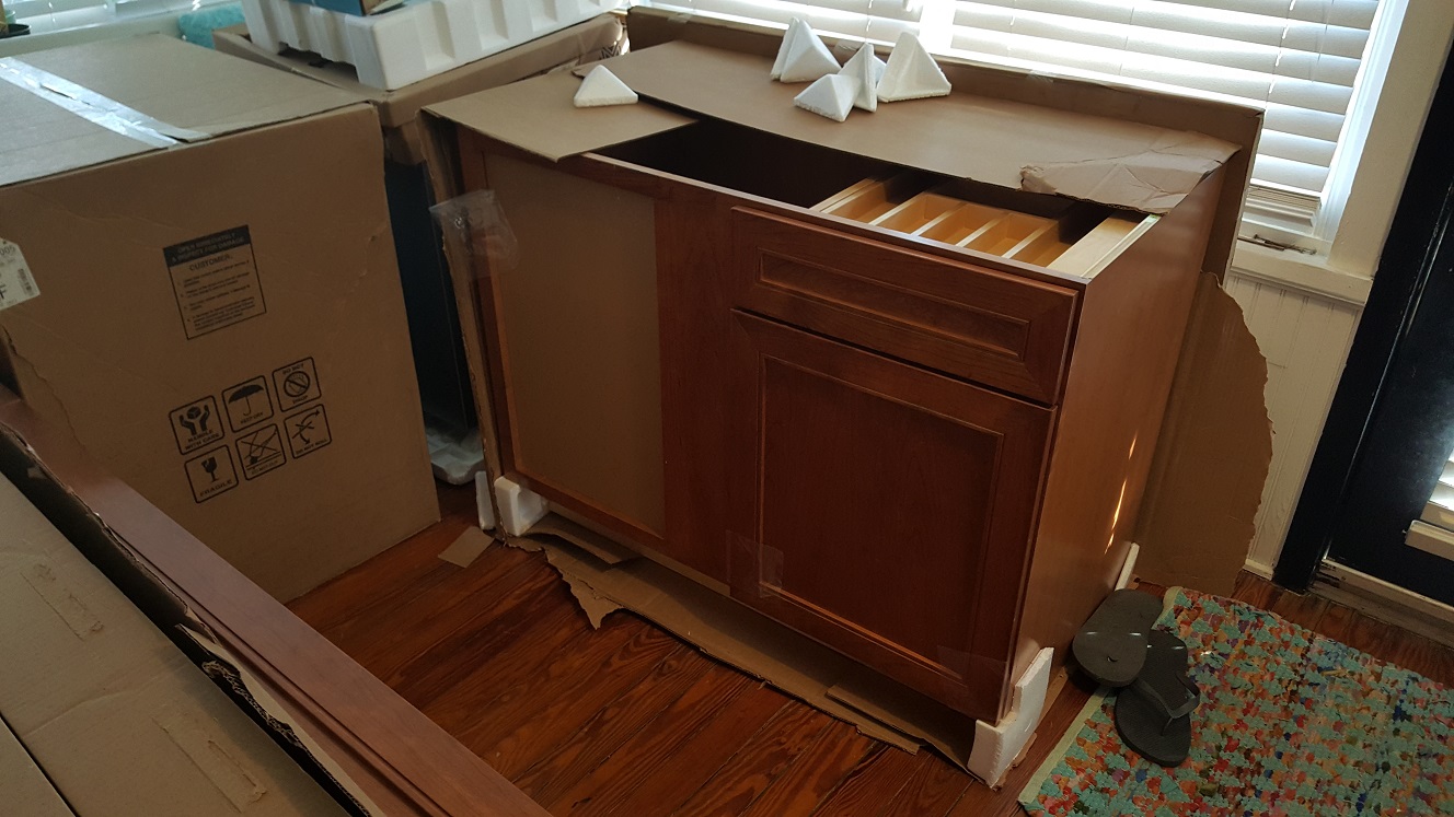 So I head out to greet the guy and he seems proud that he's here early. I caution him that the traffic for the parent pickup line for the high school is about to start backing up in front of the house. He doesn't seem at all concerned about it and asks where I want them to put the 23 boxes of cabinets. I tell him the front porch and he wants to see how much room and where to put everything. I tell him the overflow can go in the living room, but rather doubt we'll have any. He says he'll move the truck and they'll start unloading. I watch as he pulls the truck up to block both our driveway and the neighbors'. And they're taking their time about it, bringing a box at a time and sitting it on the front porch. Meanwhile, I'm opening every box as they bring to have a quick look, and to let them know I'm looking at every box. As they are inspected, I move them behind the front door, trying to fit them together in a fashion I can still get to them easily if need be.