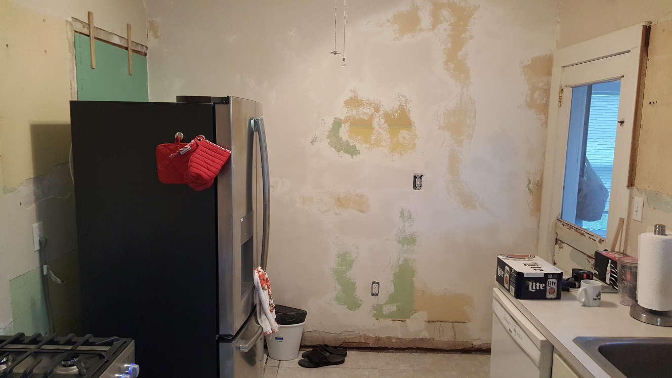 So now that the cabinets are here, it's time to get going on this plaster repair and walling off the old doorway into the hall. I start