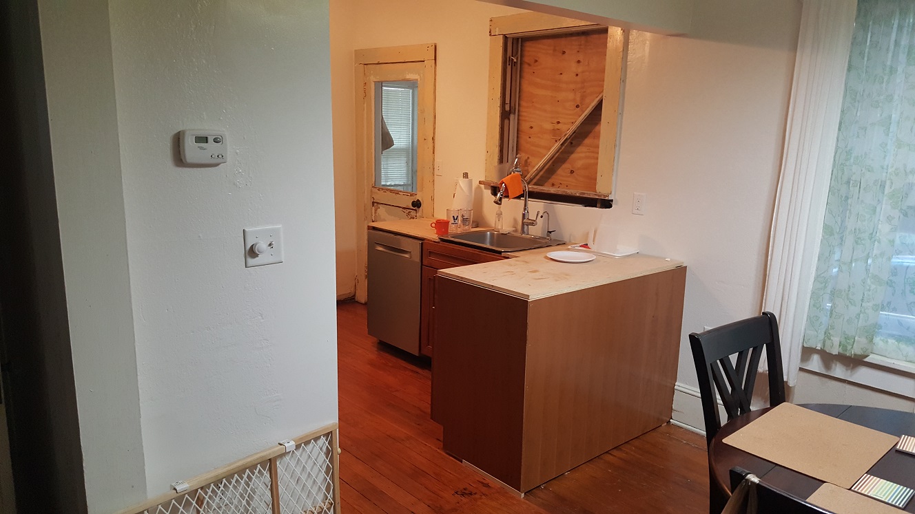 The next day I noticed it had finished completely spltting in two. I put off doing it at the time because other tasks were higher priority in the big scheme of trying to get everything ready to sand and finish the floor. Well now that's all done, and we'll be able to move the cabinets and appliances back in, this time hopefully for their final placement. But first, before the sink base is in the way and while I'm still able to walk on the not quite fully cured floor where it will be hidden under cabinets, it's time to fix and finish the window. Besides the window glass, I still have to attach the trim pieces I removed, and the bottom piece still needs trimmed shorter. I figure I'll get the sashes out first so I can measure the glass and go get the replacement cut, then do the rest.