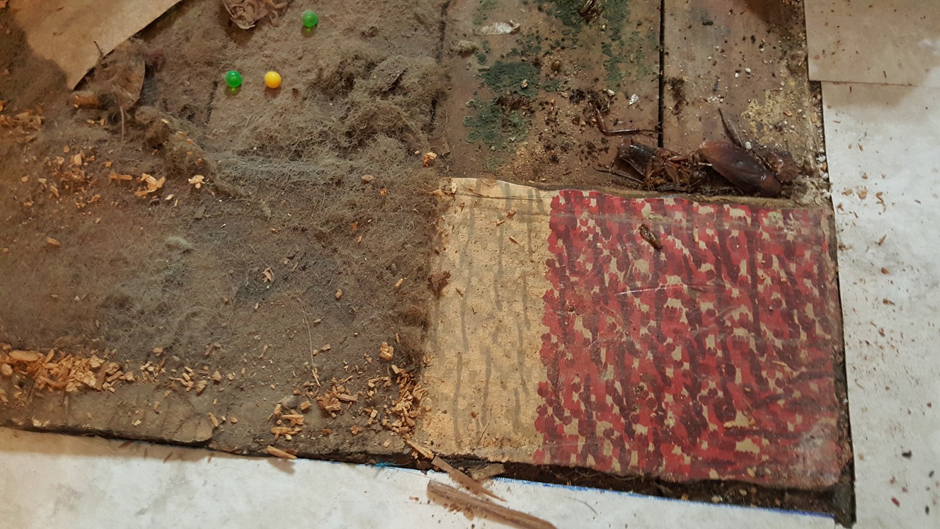 The pennisula cabinet still won't move, is it still screwed in somewhere? Maybe. Still painted together at the sink base. Probably. A few quick whacks on the joint with the cat's paw and it's free. I drag it out a bit into the dining room at an angle. What I find beneath is both curious and disgusting. More vacuuming. I find a lot of airsoft pellets, a green-yellow crayola, a used watercolor brush, and a lucky penny (face up). Also find a lot of dust somehow "glued" to the floorboards (spider silk?), a bunch of dead roaches (the big kind, not the little german ones I was expecting to find), and yes, two layers of linoleum.