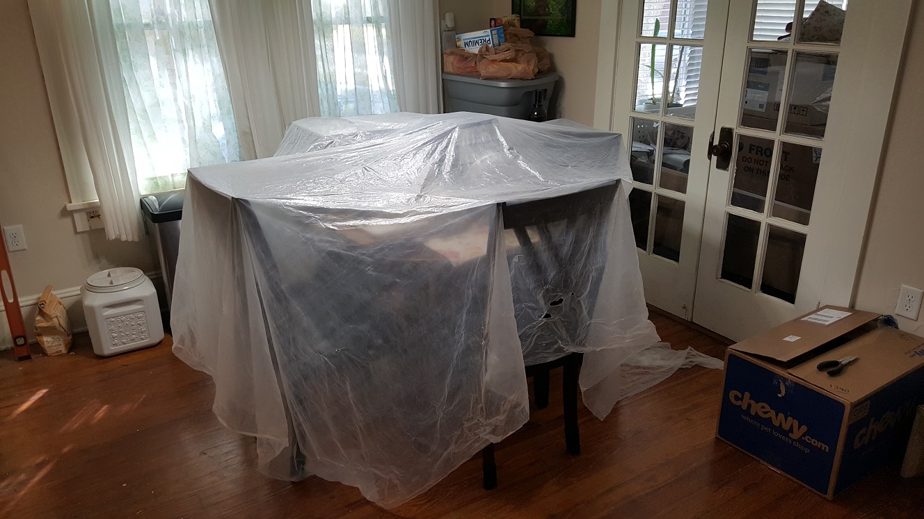 I start preparation for removal of the pennisula cabinet. First I move the microwave and the coffee maker to the dining room table and anything else that needs covered. Then I spread the plastic dropcloth over it. Next I remove the drawers from the cabinet to the living room and then remove the doors, then the slides, then the long middle shelf, then the screws holding down the countertop and the unit to the sink base and the wall. I mark a rough line and cut the countertop along the sink base with the Dremel Saw. Bummer, not deep enough.