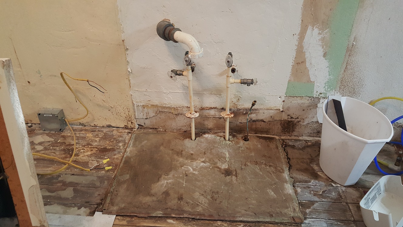 is still hidden behind that wall. I remove just enough plaster to reveal the bottom of the cast iron "tee"