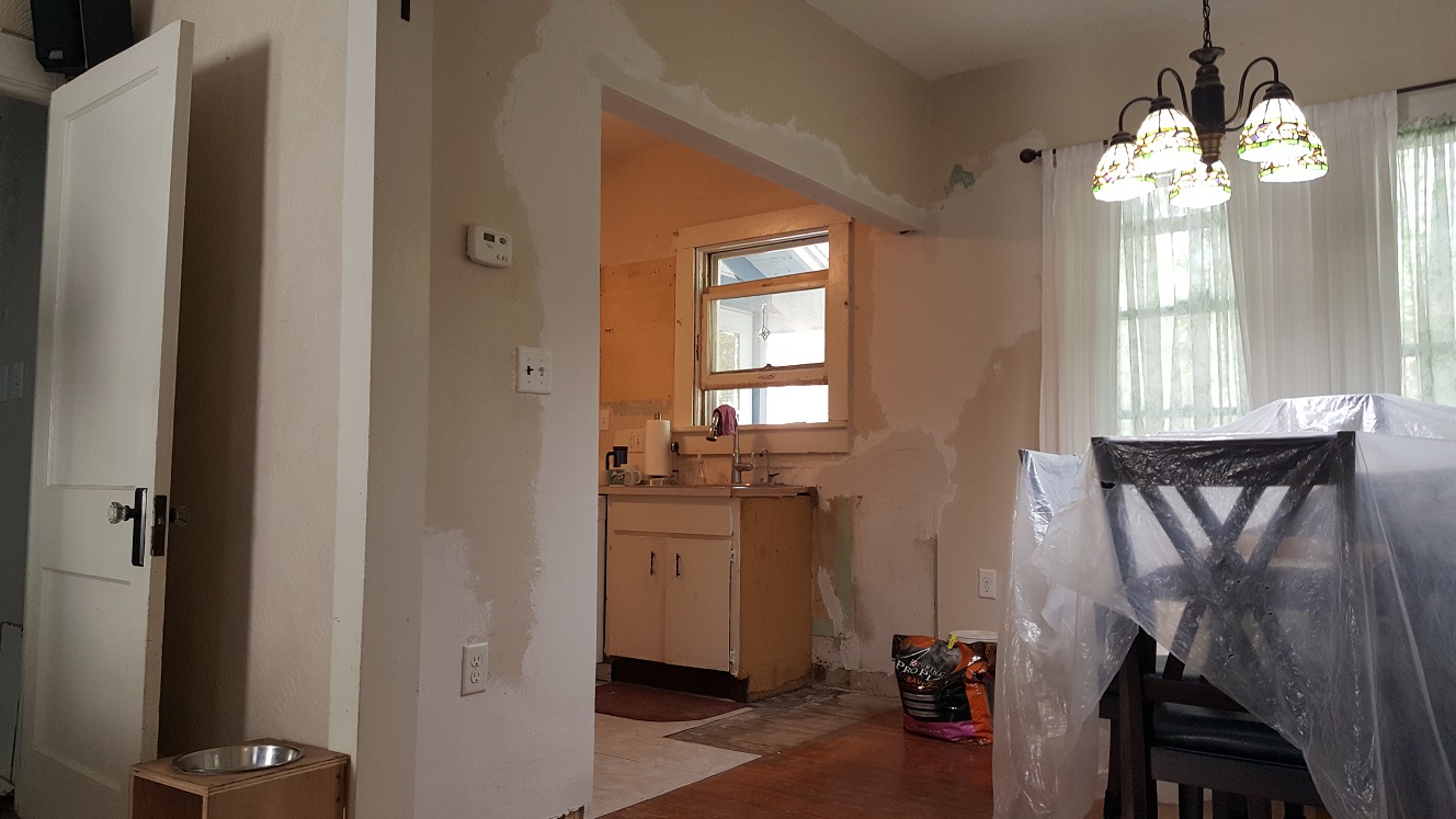 The first batch fills in kitchen side and underside nicely. The second batch fills in dining room side and big patch where removing the pennisula cabinet reveals my original patch job for the makeshift back splash peeled right back off, revealing the lower vein of loose top coat beneath the huge expanse I already have above it on the dining room wall. No matter, two buckets and it's all first coated.
