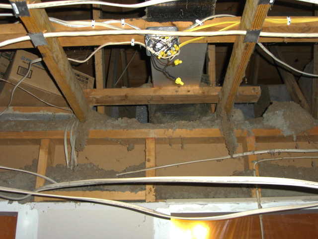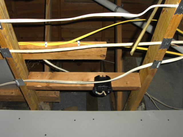 I have to head into work after the first day so Nick and Quinci are on their own. At least two extra days, another box of 14/2 wire, most of the rest of my box of 12/2, a ten foot chunk of 10/3, many new work electrical boxes, wire splices, 'staples' and nail guards later, the electricity to the kitchen is restored. Looking back I wish I would have just had her run new wire, since she had to splice pretty much everything anyway, but I can't really justify it with anything but a 'perfectionist' desire to do it right. The cost really doesn't matter, it was going to cost more regardless of how she did it, at the time the real motivation is the gigantic open air access to the attic and the increasing filth from blown insulation accumulating in the rest of the house. I just want that huge, gaping hole into the attic closed up! Running all new wire would just take that much longer to finish.